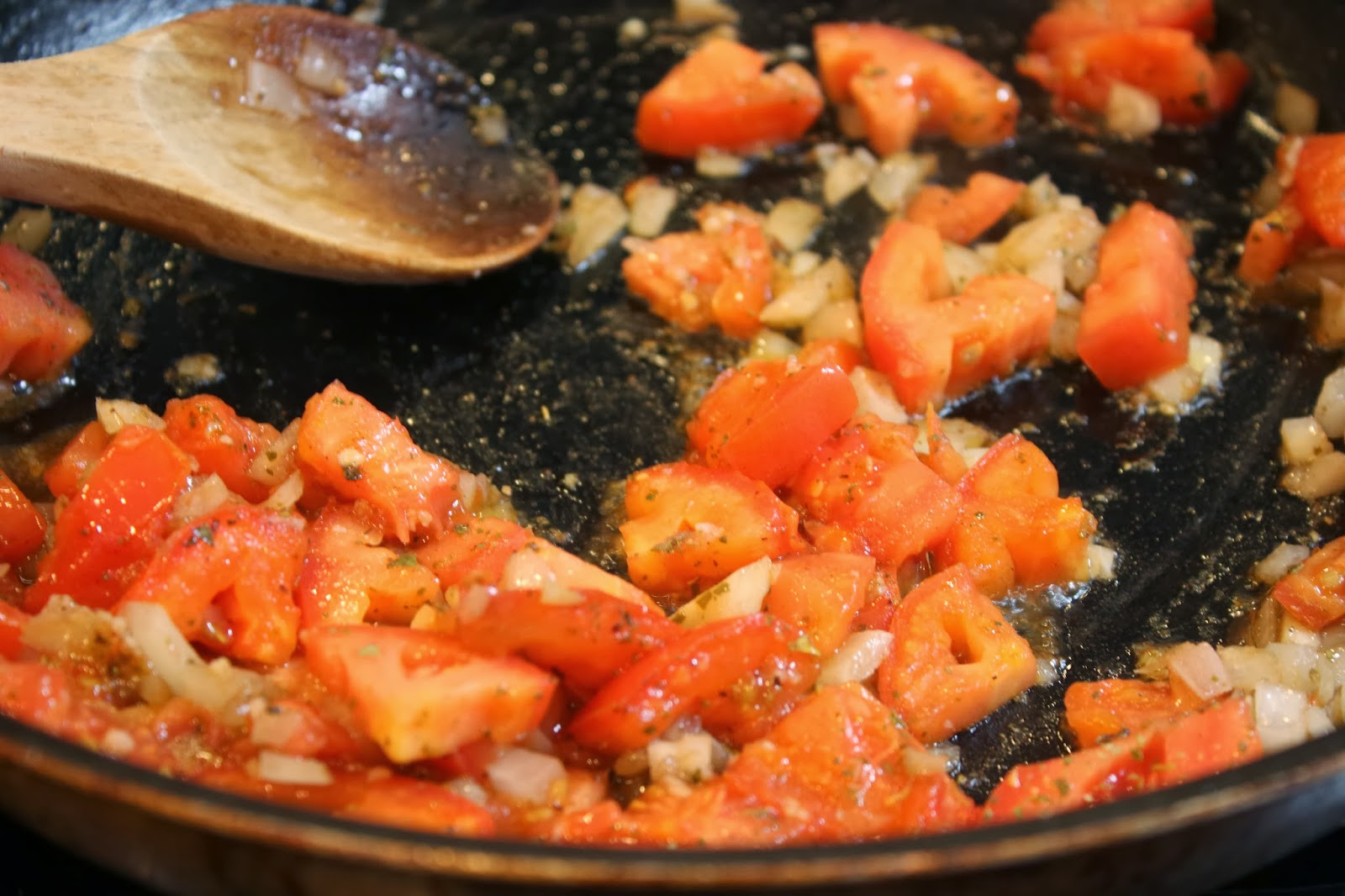 In a hot skillet, sautee in 2tbls olive oil the onion and garlic. Add the tomatoes, italian seasoning, salt and pepper.